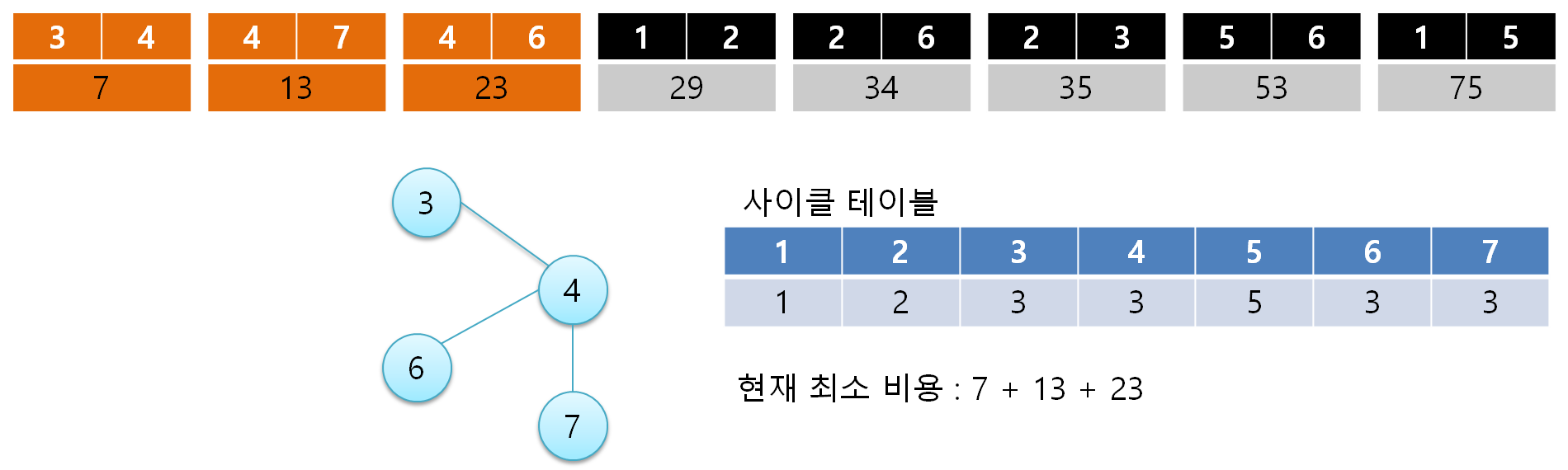 이제는 아래와 같은 동작 과정에 맞게 노드를 연결시켜 최소 비용으로 모든 노드를 연결하면 됩니다